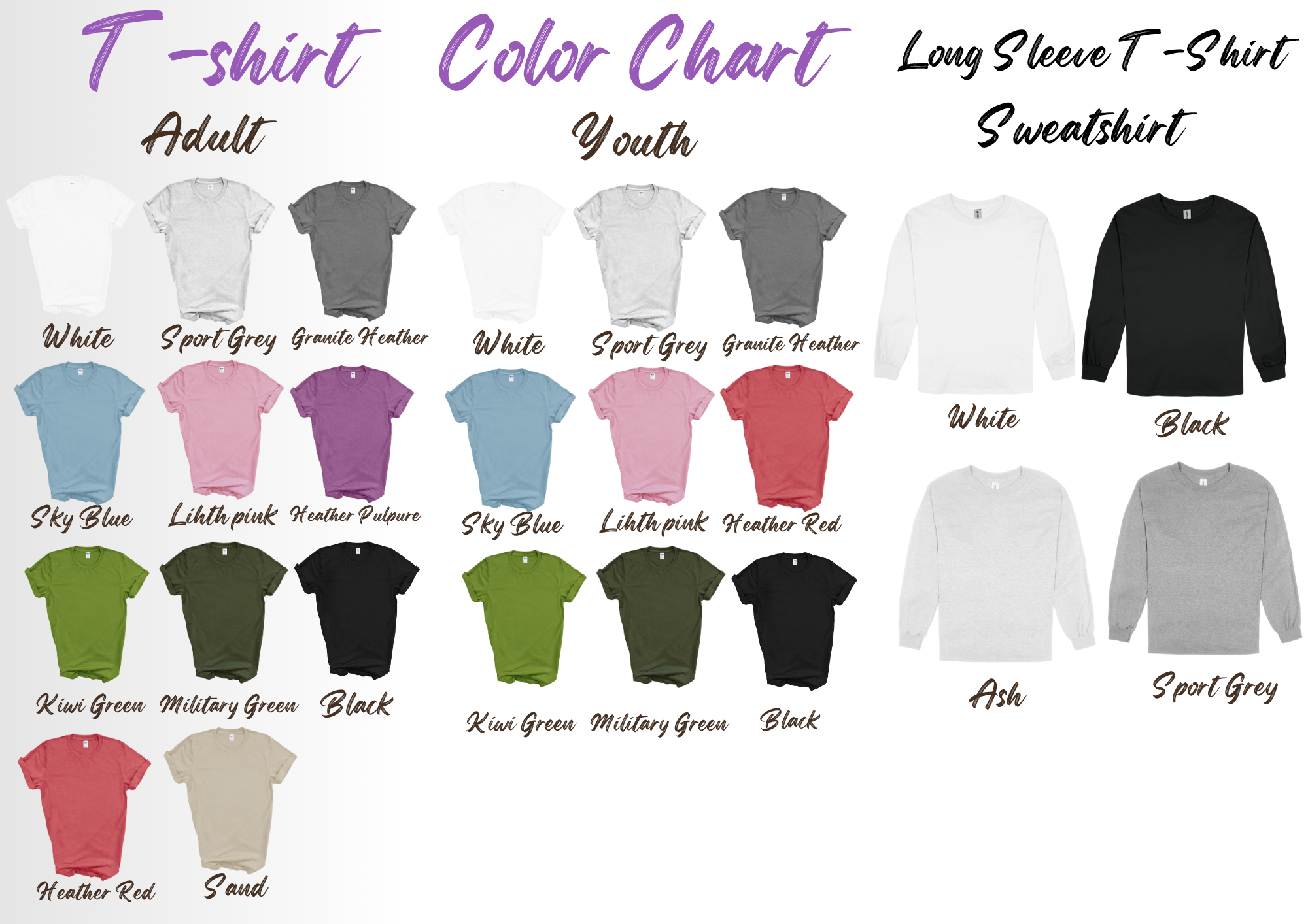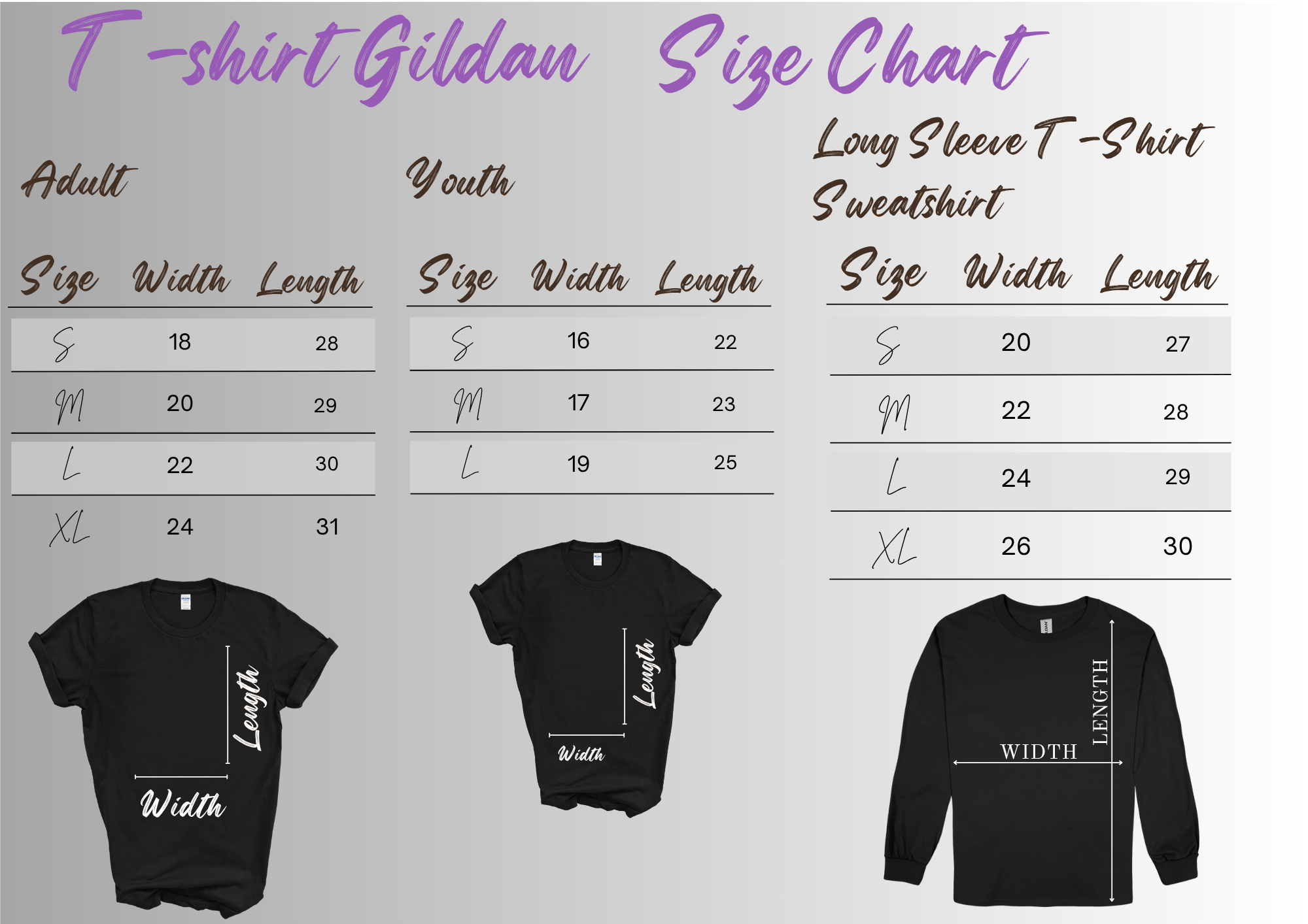 SIZING: Please go to the the Gildan's size chart on the photo section.  Adult size tshirts are UNISEX. Fit might be larger than regular ladies tshirts.